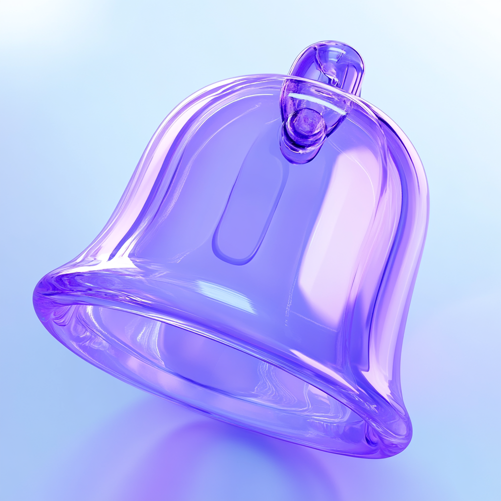 A visually striking 3D rendering of a purple glass bell with a smooth, glossy finish, set against a soft gradient background. Ideal for decorative or illustrative purposes.