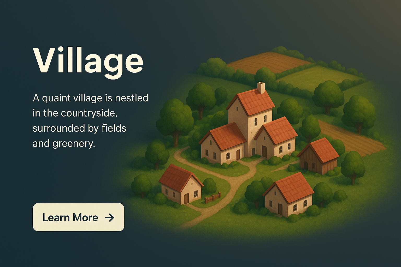 A beautifully designed 3D illustration of a quaint village surrounded by lush greenery and fields. The scene captures a peaceful rural atmosphere.