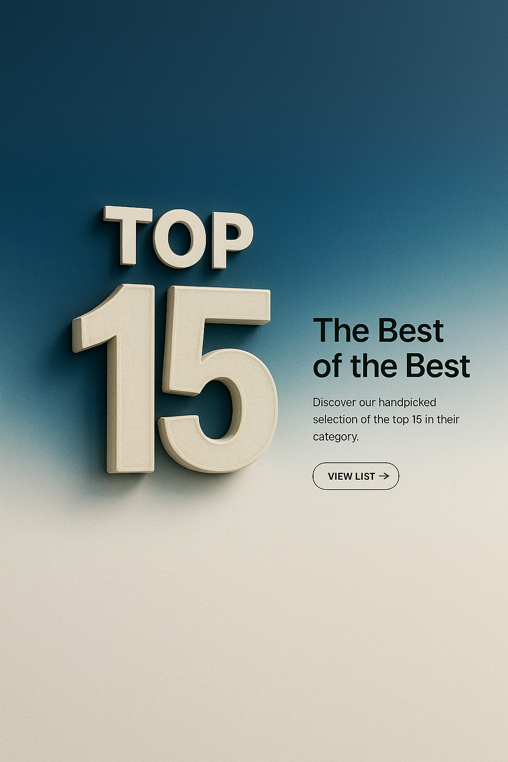 A modern web design concept showcasing a 'Top 15' list with layered visuals. The design features a gradient background and clear, readable text elements.