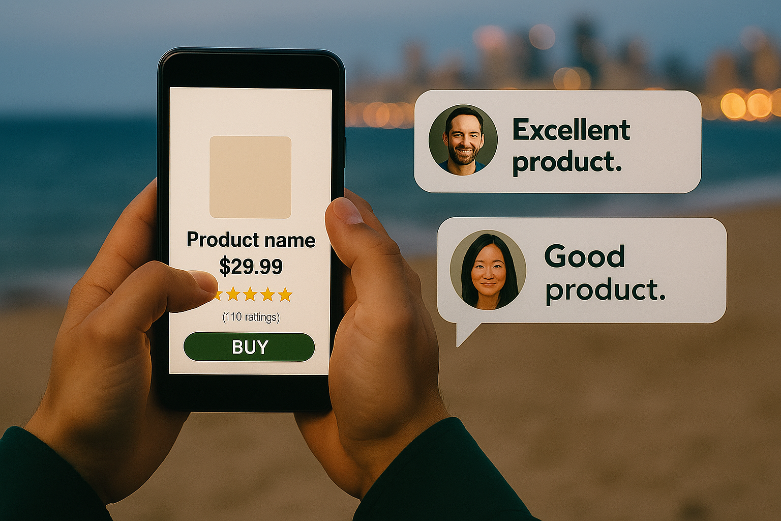 A mobile phone displaying a product with user reviews, set against a beach backdrop. Ideal for showcasing online shopping experiences and customer feedback.