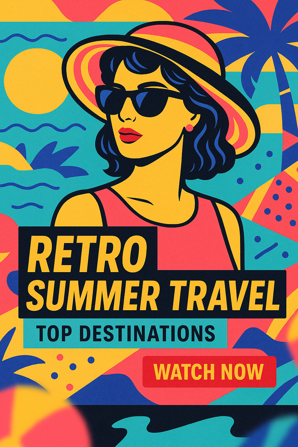 Colorful retro-themed travel advertisement featuring a stylish woman in sunglasses, perfect for enticing summer vacationers to explore top destinations.