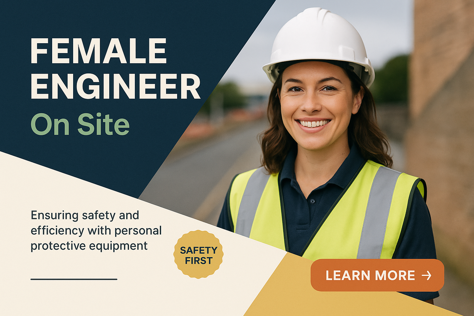 /Collection: /by davooda/Type: PNG/A cheerful female engineer wearing a hard hat and high visibility vest stands on-site, emphasizing safety and professionalism. The background features a construction environment.