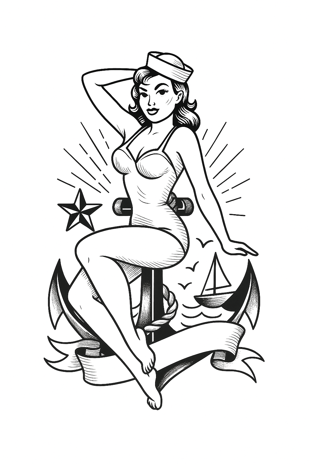 Vintage Nautical Pin-Up Illustration with Anchor Theme