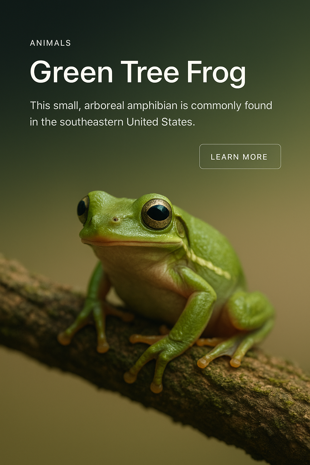 A stylish web page layout featuring a green tree frog, complemented by a gradient background. Includes a small label, title, text block, and action button with an icon.