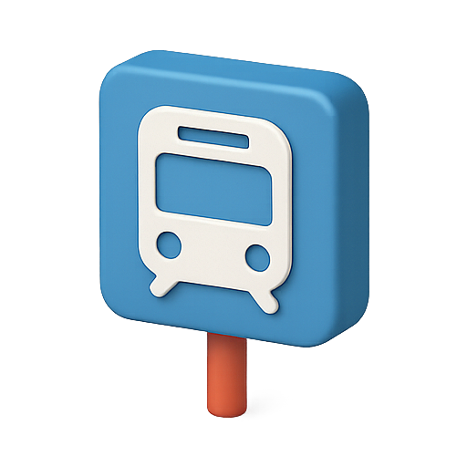 A modern 3D icon representing a bus stop, featuring a simplistic bus design on a blue background. Ideal for transportation apps or navigation services.