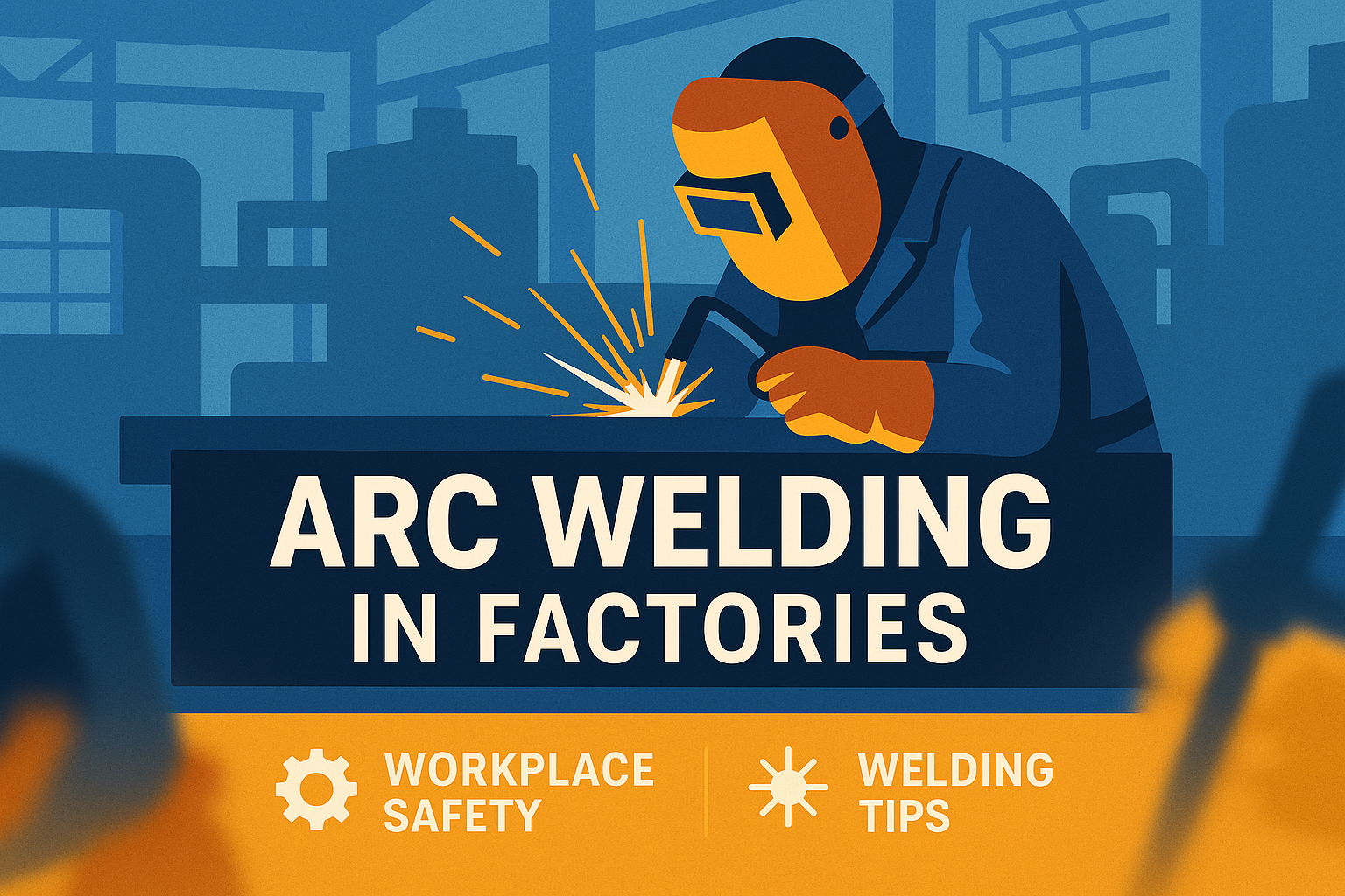 A visually engaging infographic highlighting arc welding safety tips in factory settings, designed for educational purposes and workplace awareness.