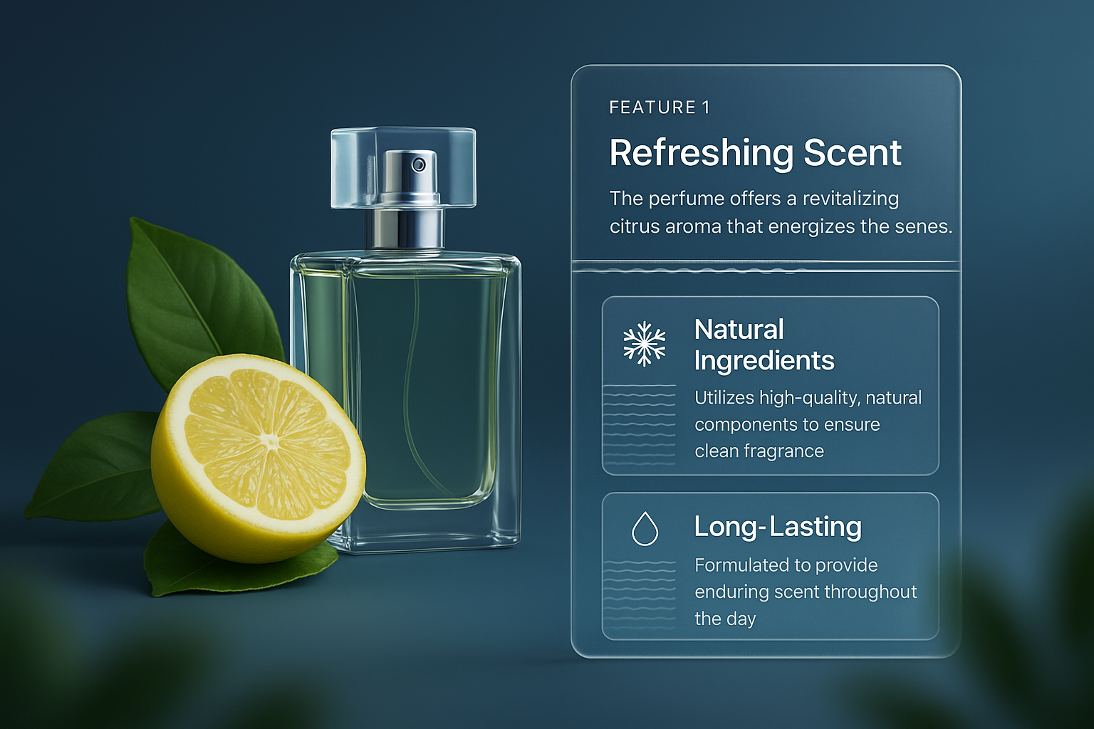 /Collection: /by davooda/Type: PNG/A visually appealing perfume bottle next to a fresh lemon, surrounded by leaves. The design includes feature highlights about the perfume's scent and ingredients.
