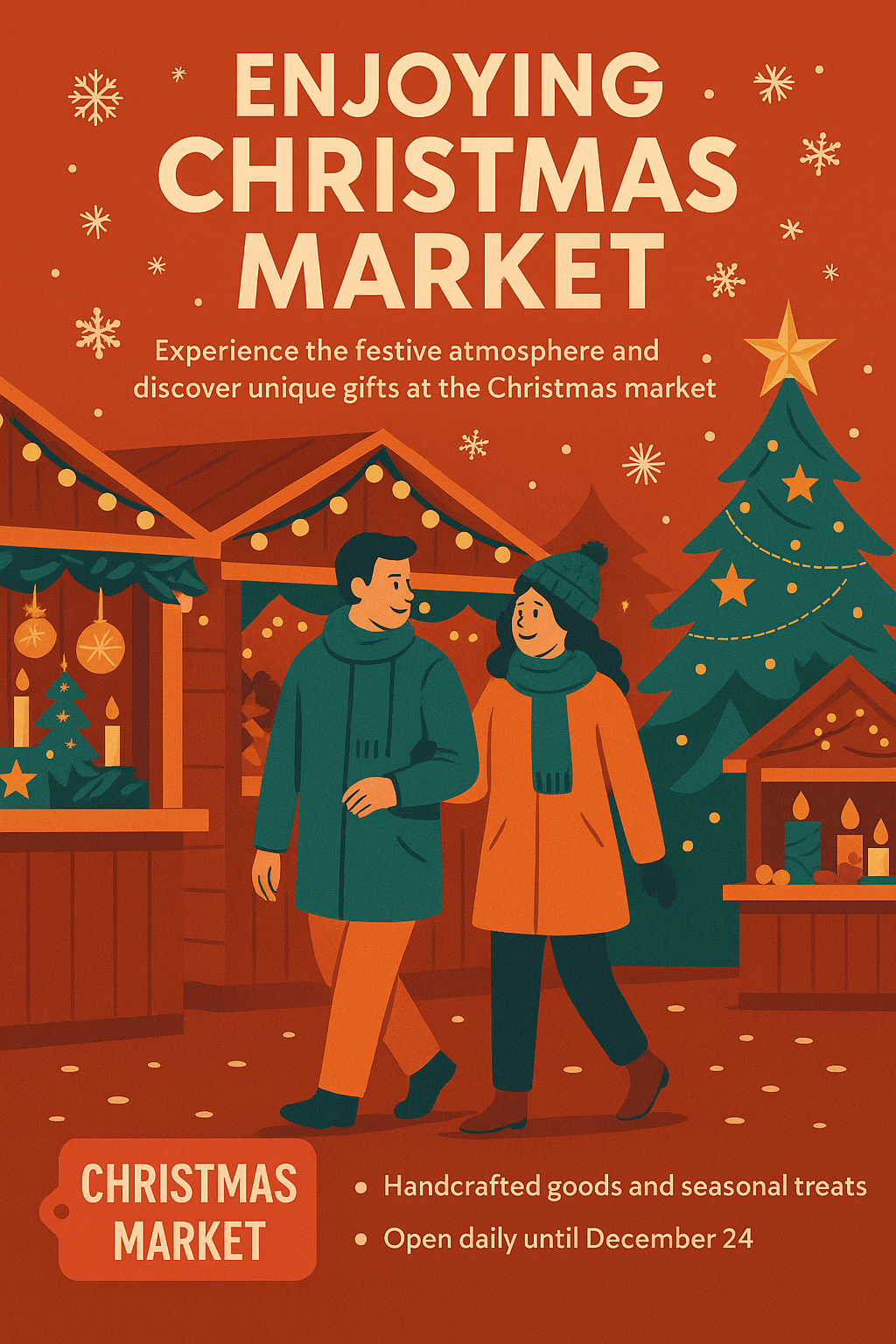 A vibrant promotional poster for a Christmas market featuring cheerful characters, seasonal decorations, and a cozy atmosphere. Ideal for holiday marketing.