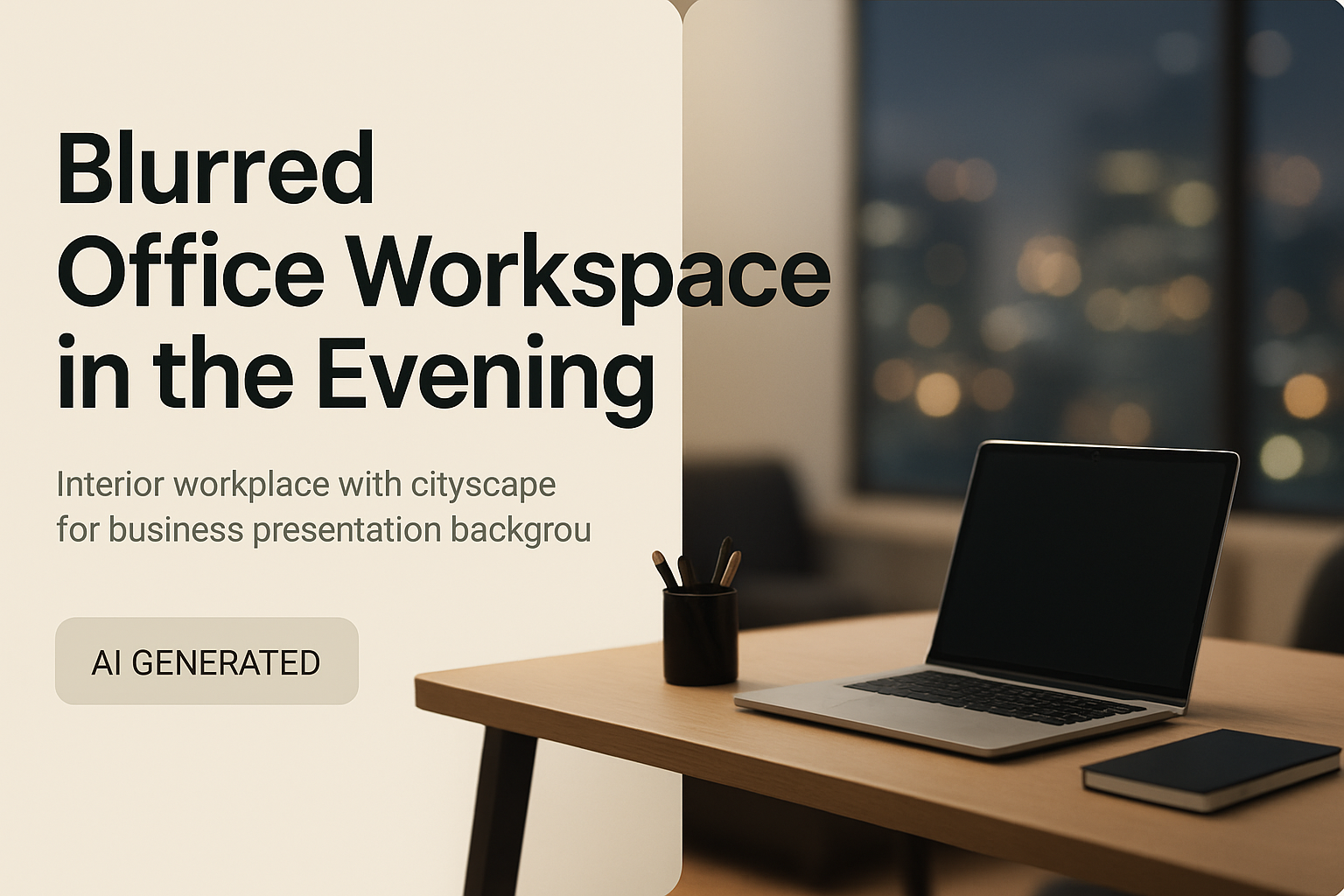 A blurred office workspace in the evening, featuring a clean corporate style with a cityscape. The composition includes geometric blocks, bold typography, and a well-lit object, creating a professional atmosphere.