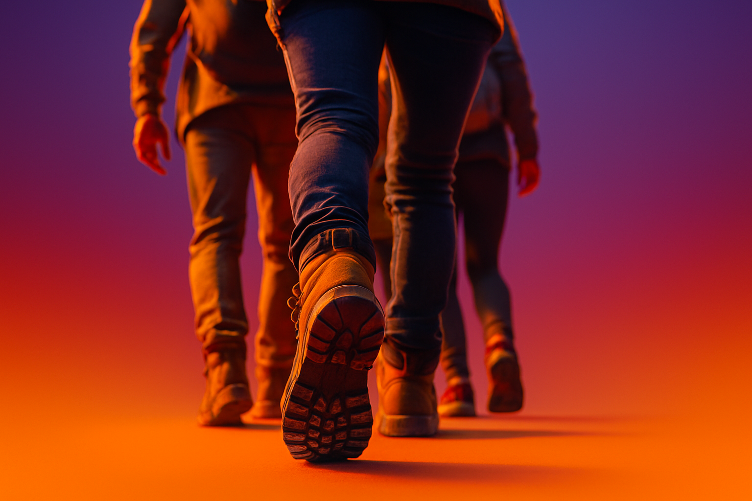 A close-up view of tourists' feet walking along a vibrant autumn forest path, showcasing their footwear against a smooth gradient background. The scene captures an engaging travel moment.