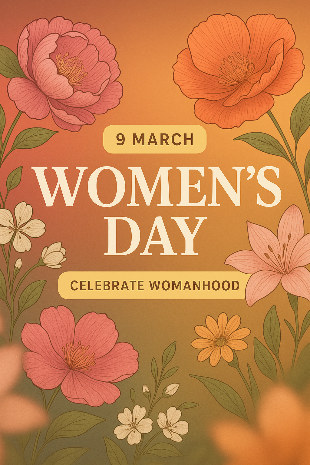 A vibrant graphic celebrating Women's Day with floral illustrations, perfect for social media or event promotion targeting audiences interested in women's rights and empowerment.