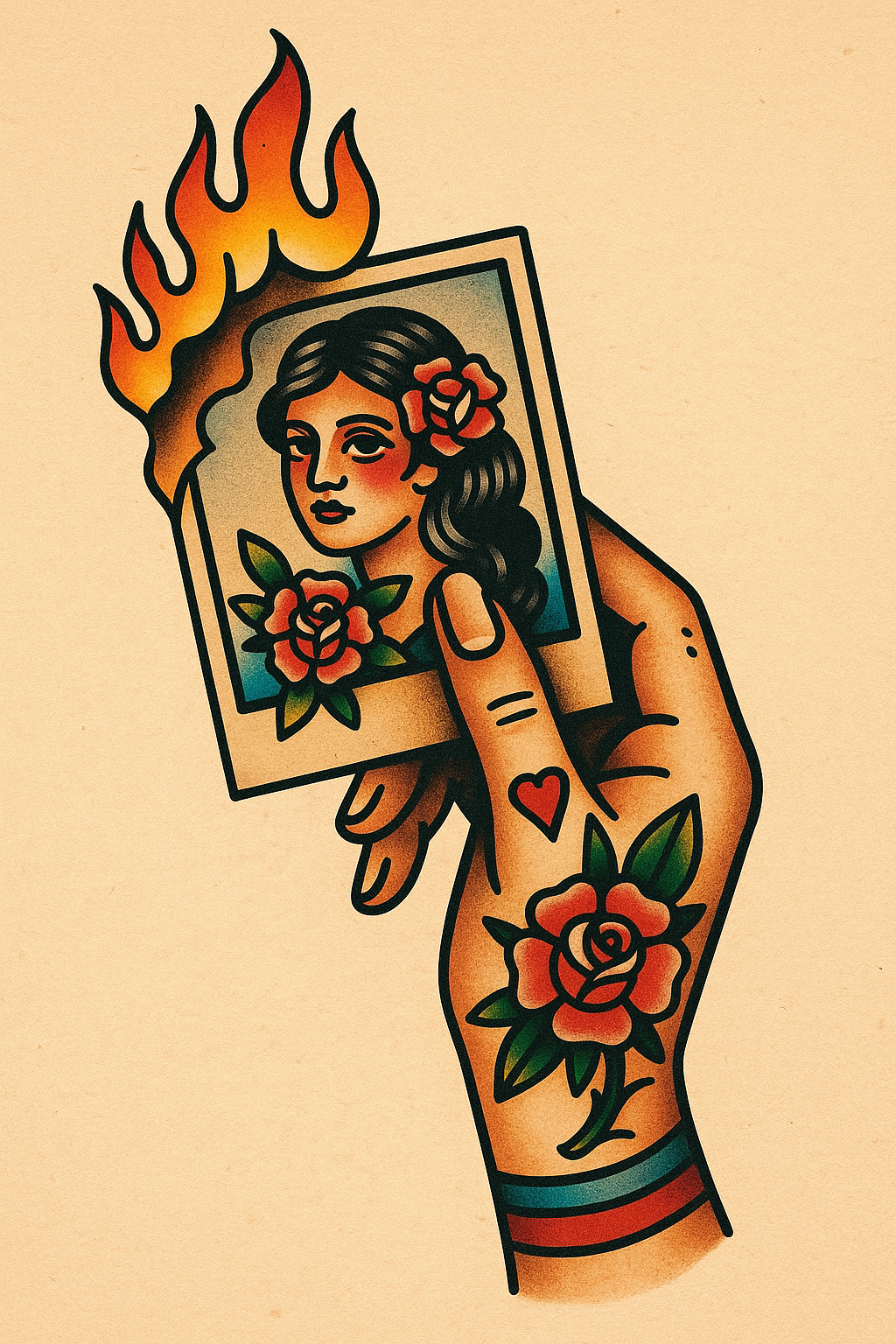 A hand holds a photograph that is burning at the edges, featuring a woman's face and flower designs. The hand is adorned with vibrant floral tattoos on a light beige background.