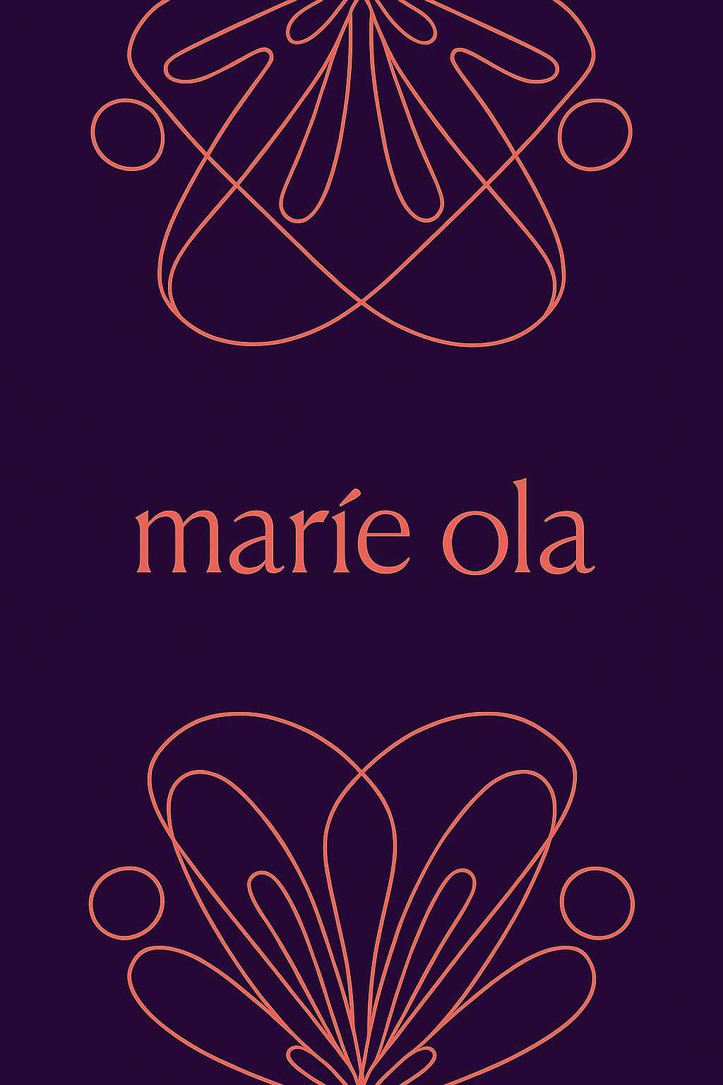 An artistic design featuring elegant floral patterns in a symmetrical layout with the text 'marie ola' at the center, set against a dark background.