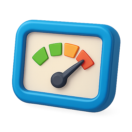 3D icon of a gauge with colorful indicators, representing measurement levels. Suitable for use in apps, websites, or presentations to depict performance or status.
