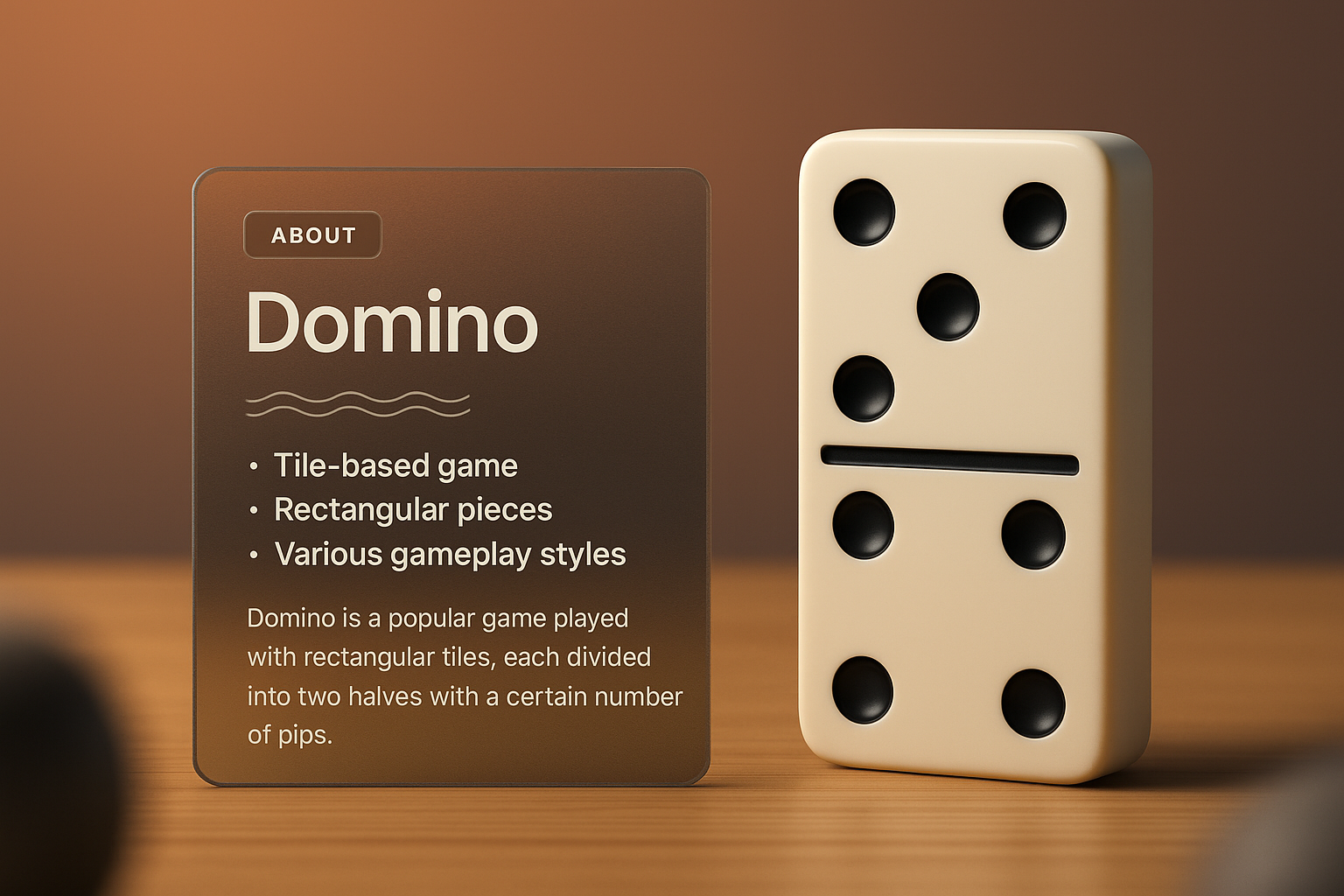 A 3D rendering of a domino piece alongside an informational card. The card features a clean layout with game details, set against a warm gradient background.