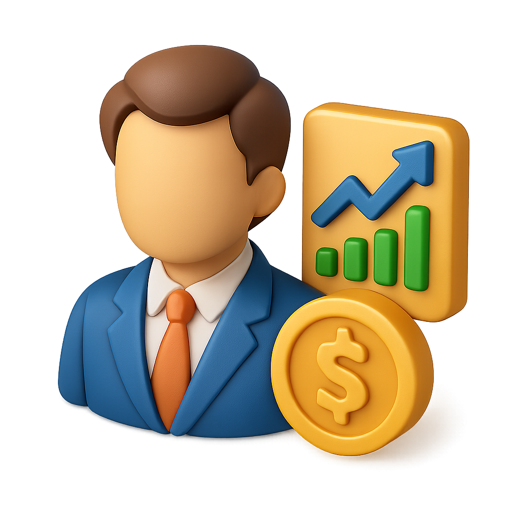 A vibrant 3D icon depicting a broker figure in a suit, accompanied by a dollar sign and a graph showing upward growth. The design features a transparent background and a three-quarter view.