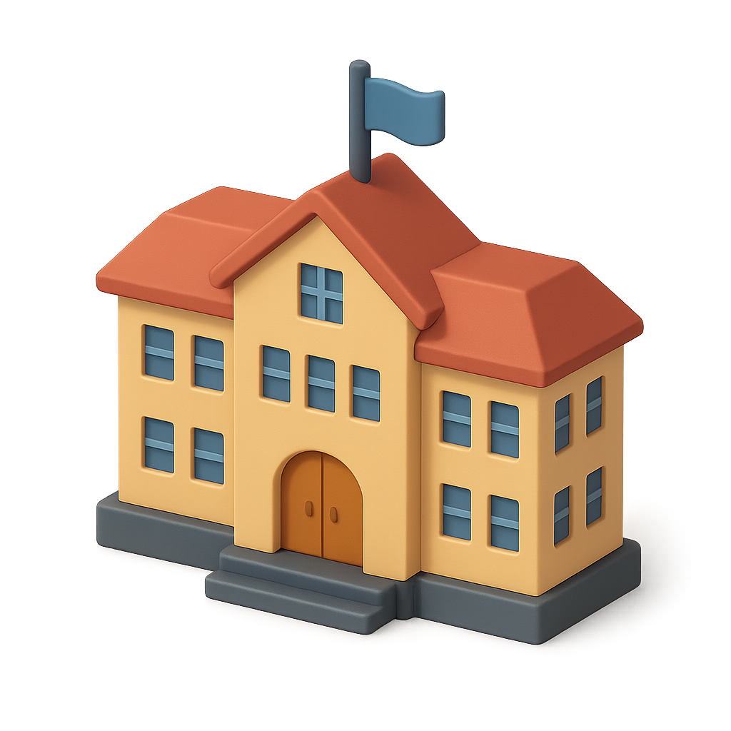 A colorful 3D icon of a boarding school, featuring a flag atop its roof. The building has distinct windows and doors, set against a soft gradient background.