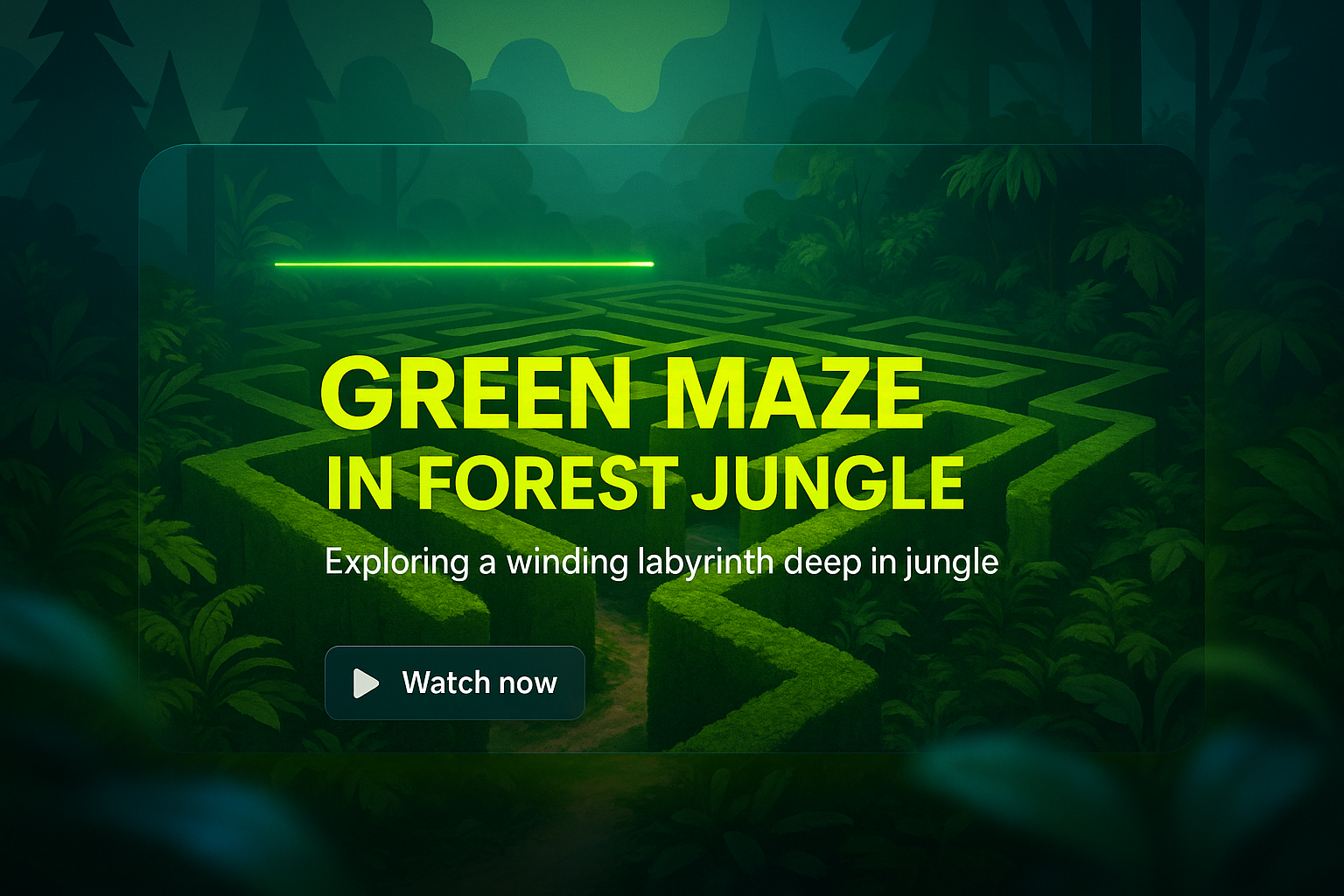 Vibrant graphic showcasing a lush green maze set in a forest jungle, designed for digital content promoting exploration or adventure. Ideal for video or interactive media.