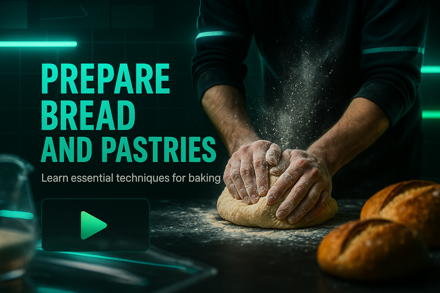 Visually engaging graphic showcasing a person kneading dough, ideal for a baking tutorial. The modern design elements highlight essential techniques for making bread and pastries.