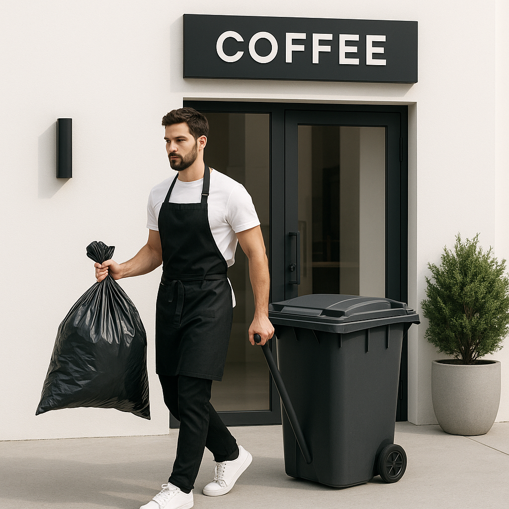 Barista Taking Out the Trash in Modern Minimalist Setting