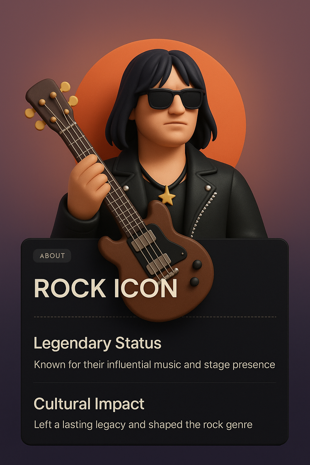 A stylized 3D rock icon holding a bass guitar, set against a smooth gradient background. The design integrates dark informational blocks detailing legendary status and cultural impact.
