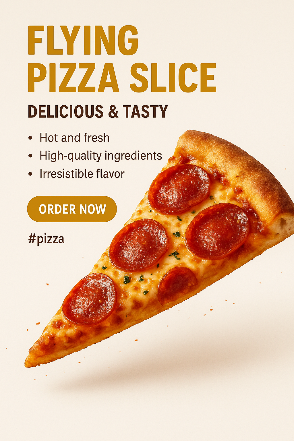Vibrant promotional image featuring a flying slice of pizza, emphasizing quality and taste. Ideal for food marketing and social media posts.