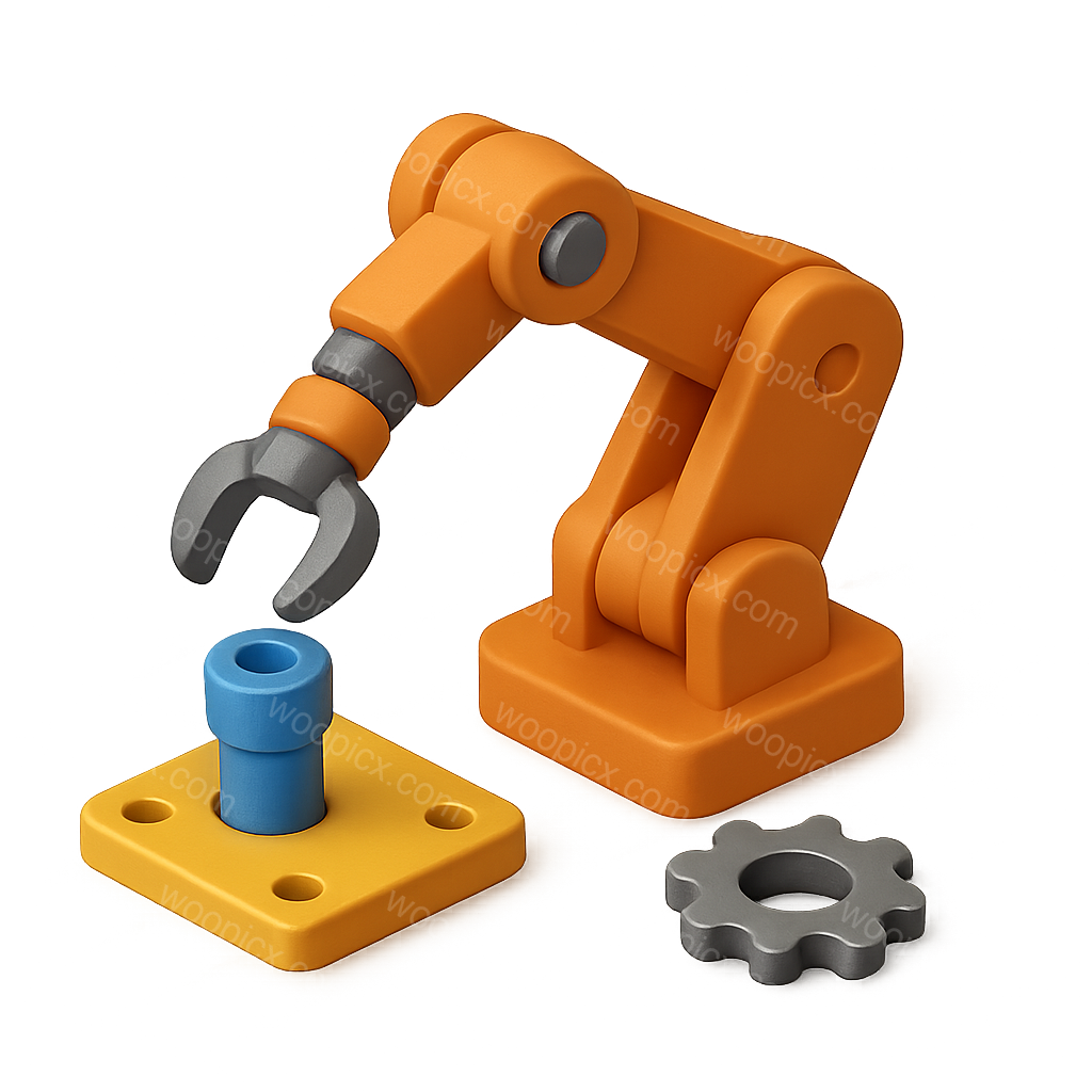 A 3D icon depicting a robotic arm in the process of assembling parts. The arm features vibrant colors and a transparent background, showcasing a gear and a blue component.