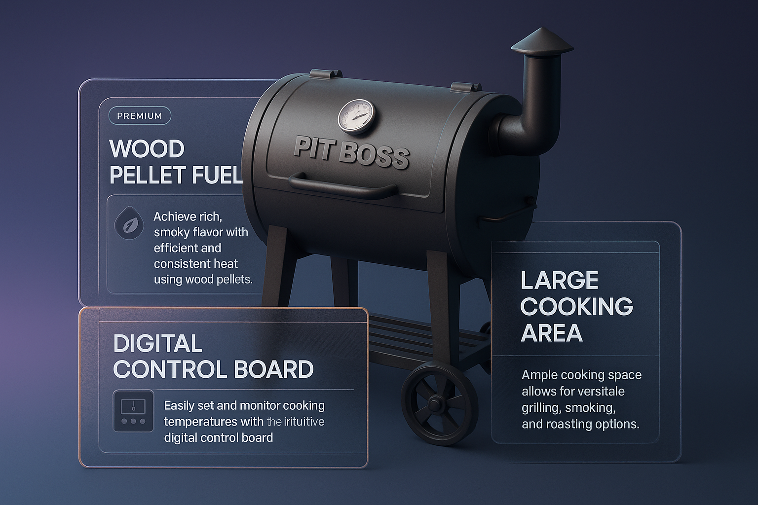 /Collection: /by davooda/Type: PNG/A 3D illustration showcasing a Pit Boss grill with feature highlights. The design includes a gradient background, clear text blocks, and subtle effects for depth.