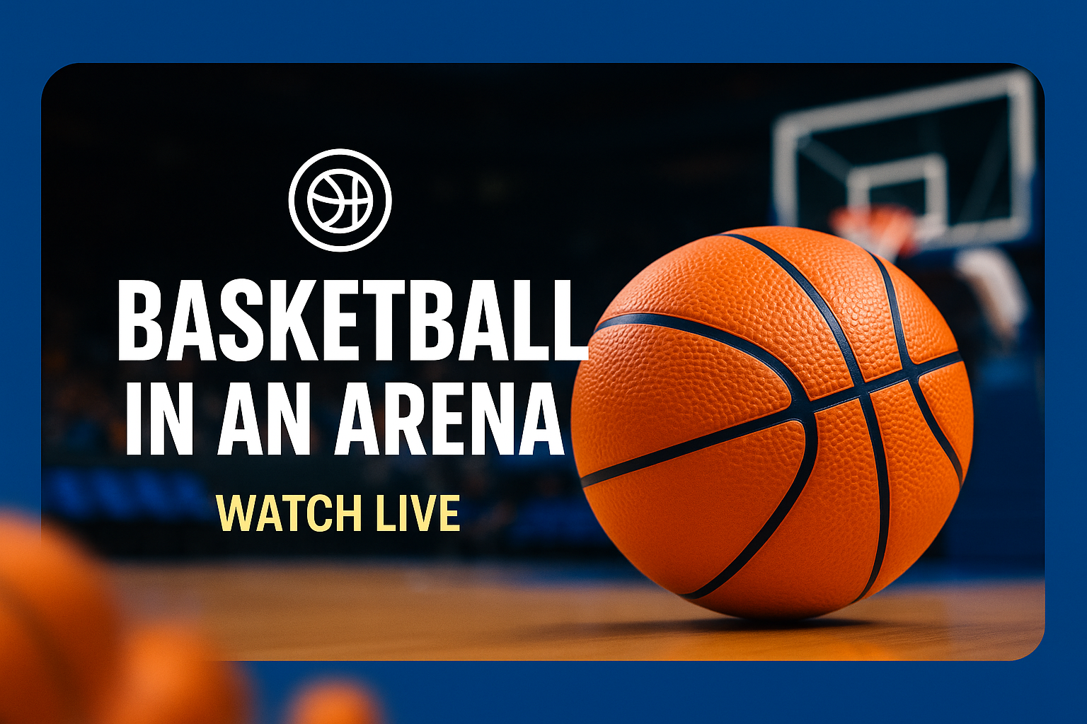 Vibrant promotional graphic for live basketball events, featuring a basketball and arena backdrop, designed to capture the excitement for sports fans.