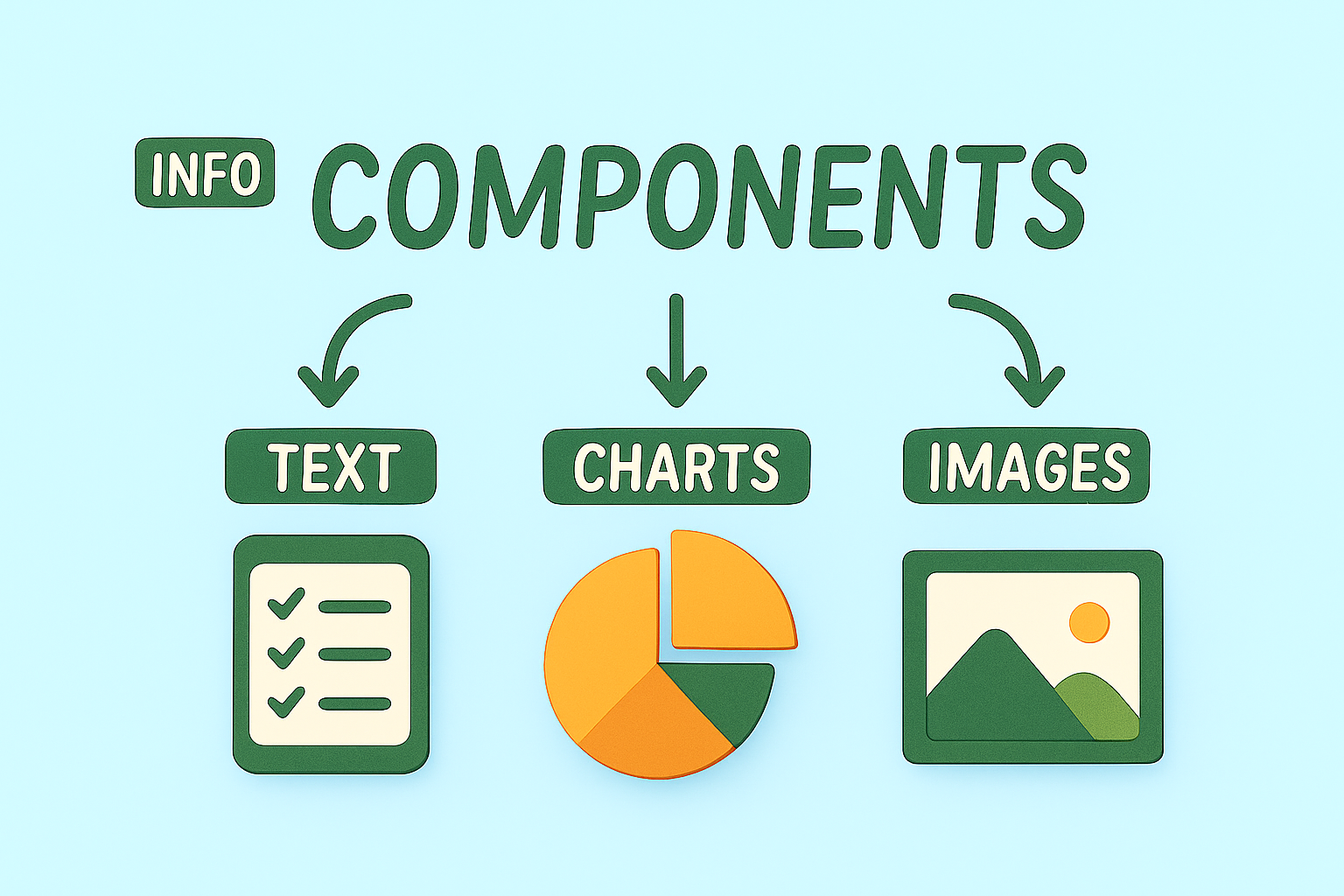 Colorful infographic depicting the three main components of information: text, charts, and images, using simple icons and a clean design. Ideal for educational materials.