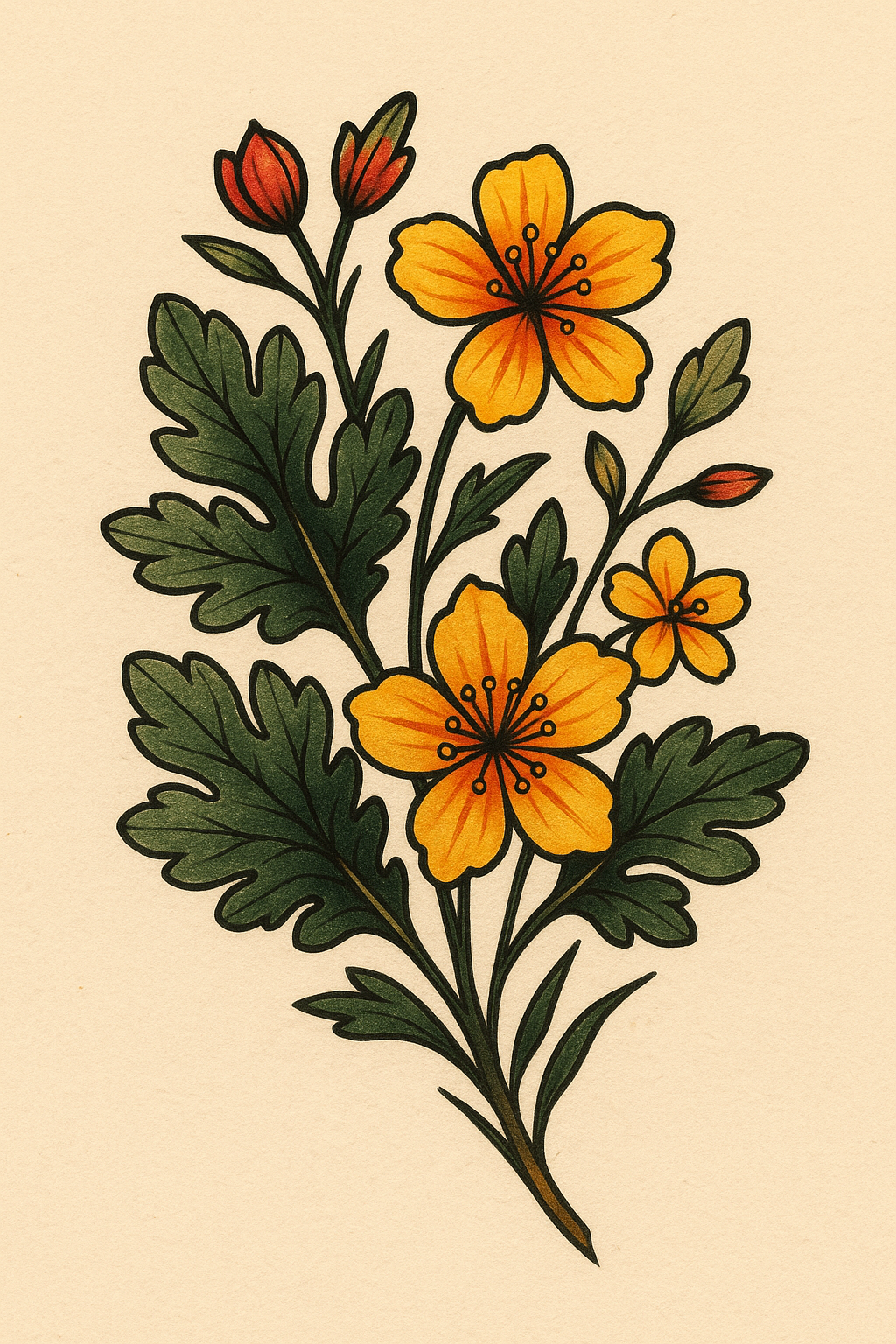 /Collection: /by davooda/Type: PNG/A beautifully detailed floral illustration showcasing yellow flowers and green leaves on a soft beige background. Ideal for botanical art enthusiasts and decorative purposes.
