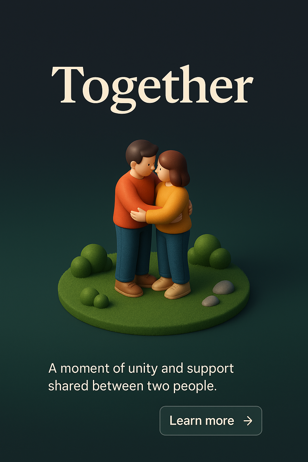 /Collection: /by davooda/Type: PNG/A beautifully crafted 3D scene showcasing two people embracing, symbolizing unity. The background features a smooth gradient with lush green elements, creating a warm atmosphere.
