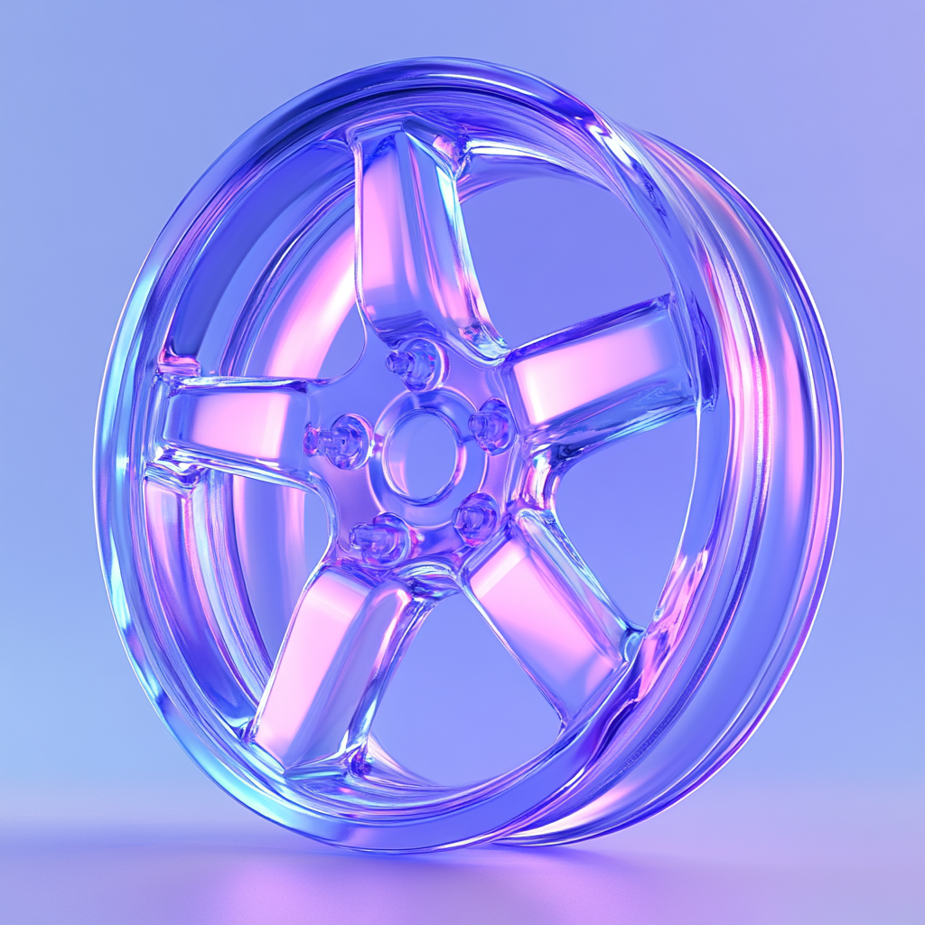 A visually striking 3D rendering of a car wheel featuring a glossy finish and gradient colors. Ideal for automotive design presentations and advertising.