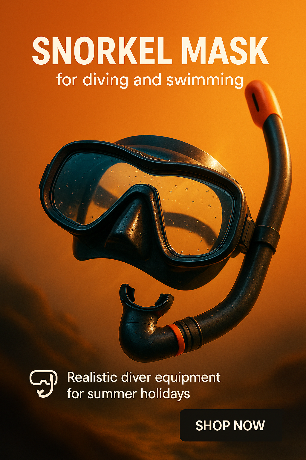 This promotional image showcases a snorkel mask against a vibrant sunset background. It is designed for diving and swimming enthusiasts, appealing to summer holiday shoppers.