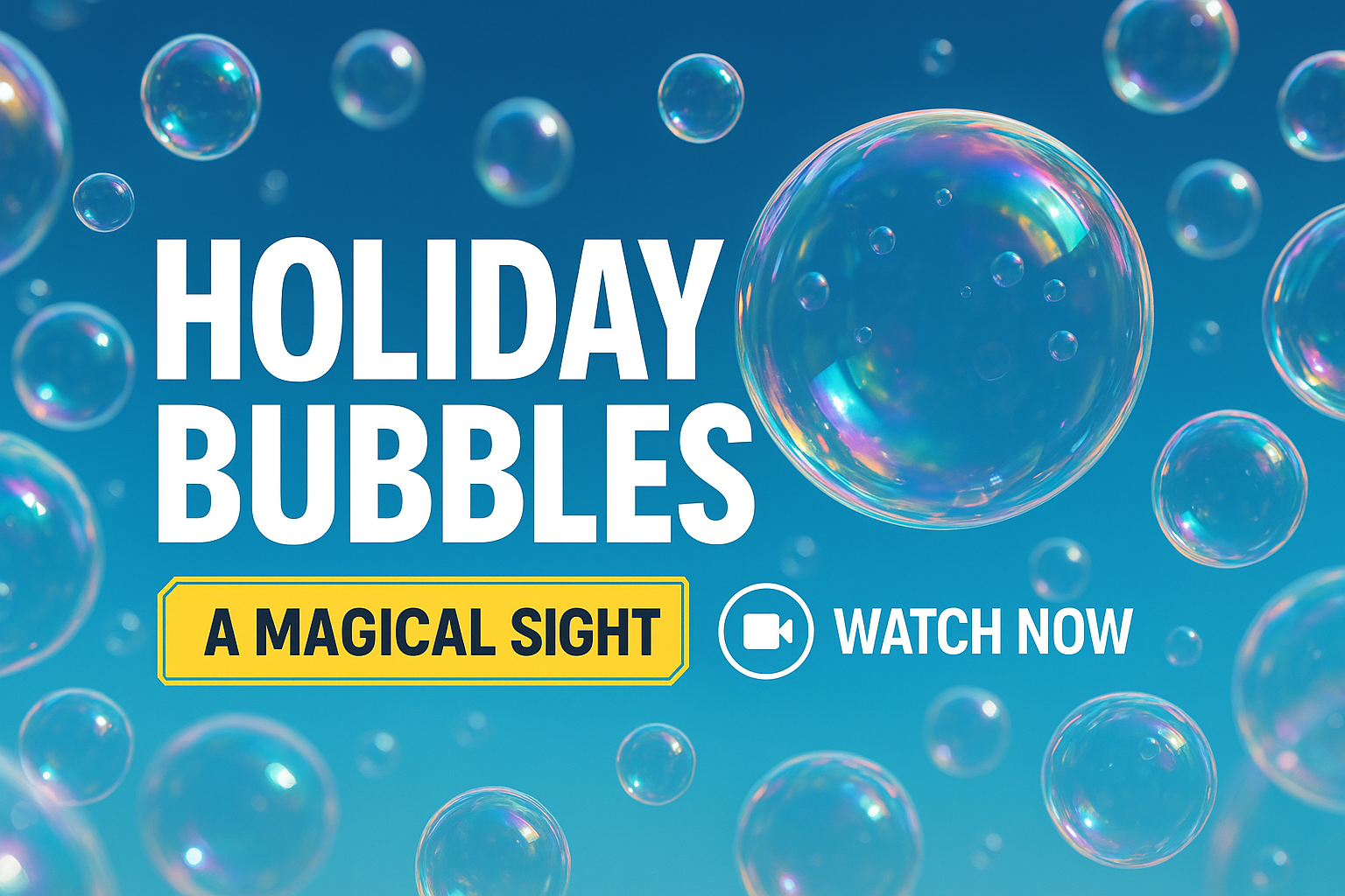 Vibrant promotional banner showcasing bubbles against a blue background, ideal for holiday-themed content. The design invites viewers to engage with a video.