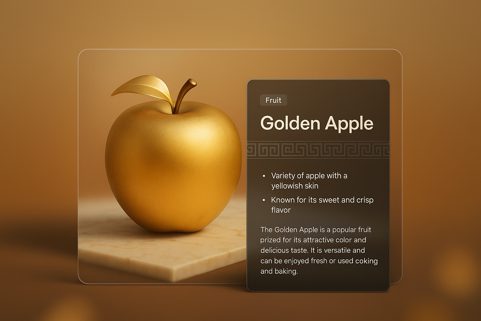 /Collection: /by davooda/Type: PNG/A beautifully rendered 3D golden apple sits on a smooth surface, accompanied by an elegant info panel. The apple shines with a yellowish hue, showcasing its crisp texture, while the panel features a dark background with descriptive text.