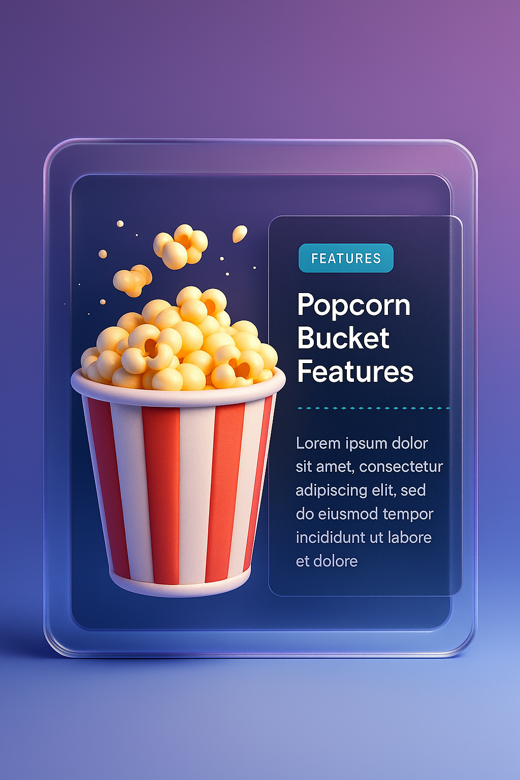/Collection: /by davooda/Type: PNG/A vibrant 3D illustration of a popcorn bucket filled with popcorn, overlayed with a transparent feature description block. The background transitions from a gradient to a solid color, enhancing the visual appeal.