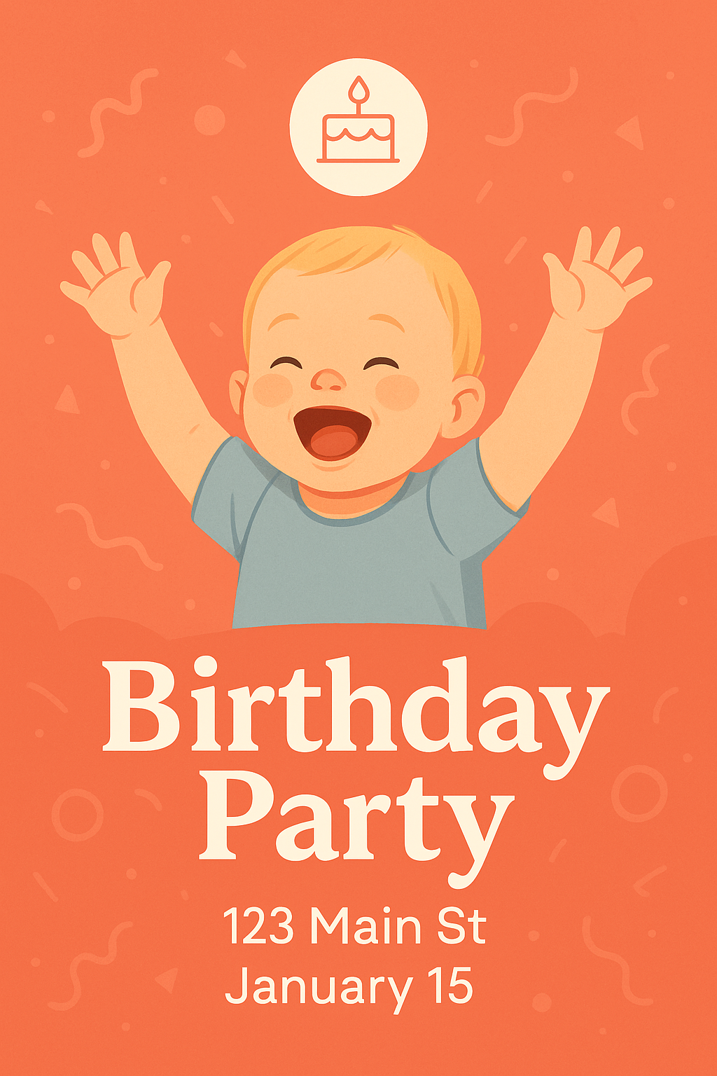 Playful birthday party invitation featuring a joyful child illustration and festive design elements, ideal for children's celebrations.