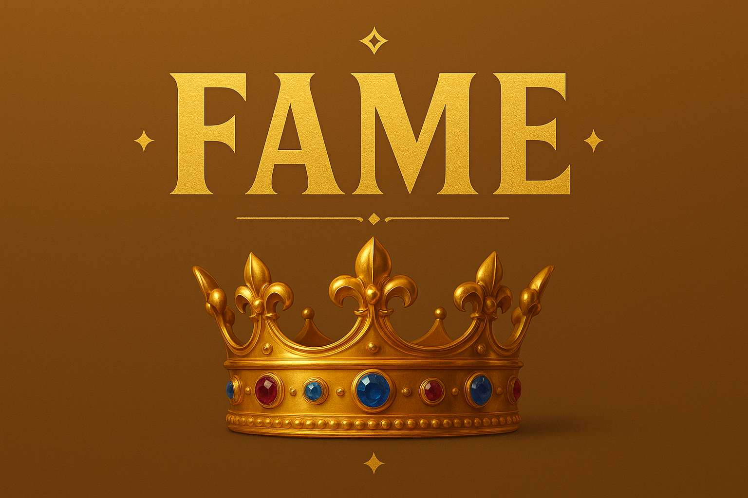 Stylized graphic featuring a golden crown and the word 'FAME' in bold typography. Ideal for themes related to recognition, achievement, or luxury branding.
