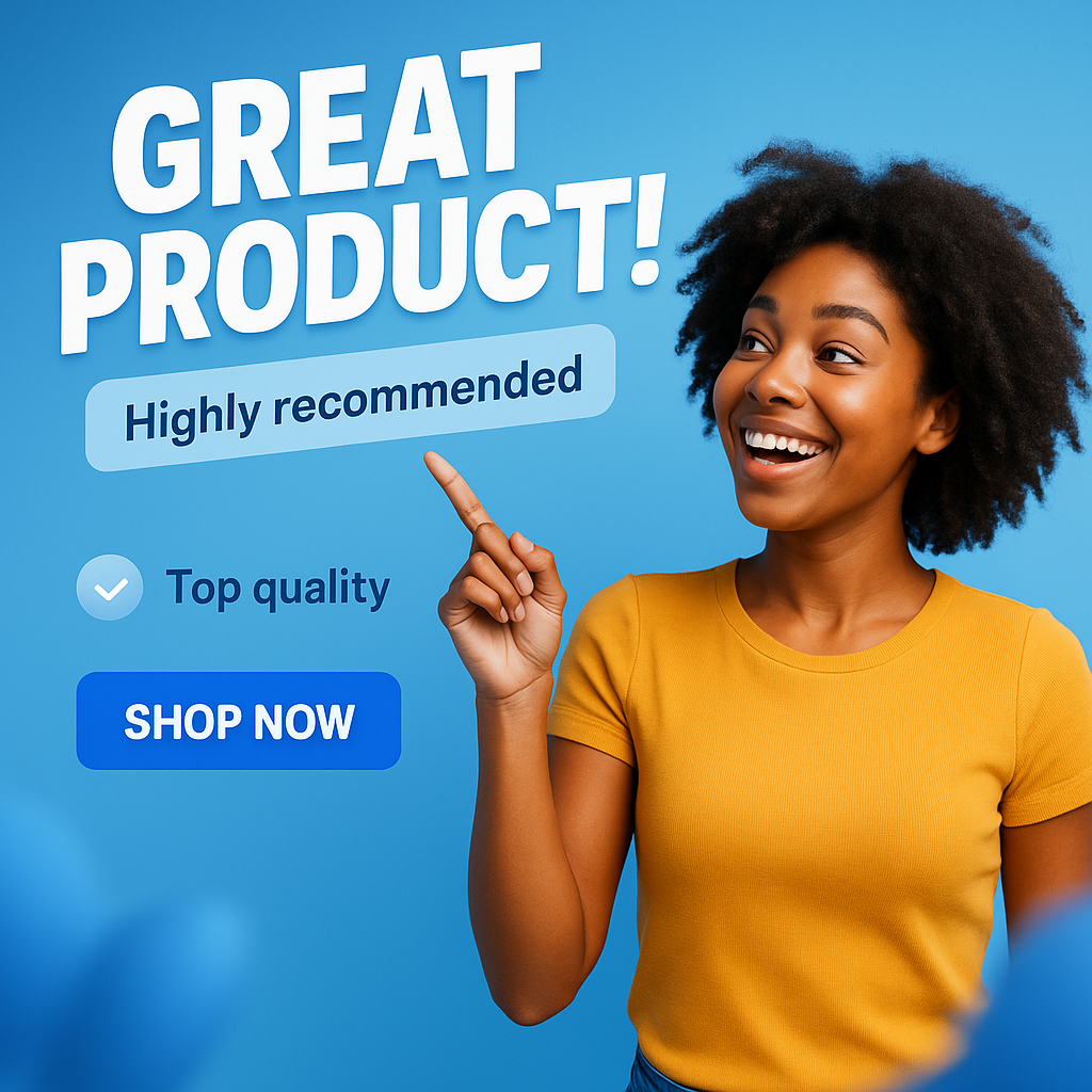 /Collection: /by davooda/Type: PNG/This vibrant social media post features a smiling woman endorsing a product with a call to action. The design uses bright colors and bold typography to attract attention.