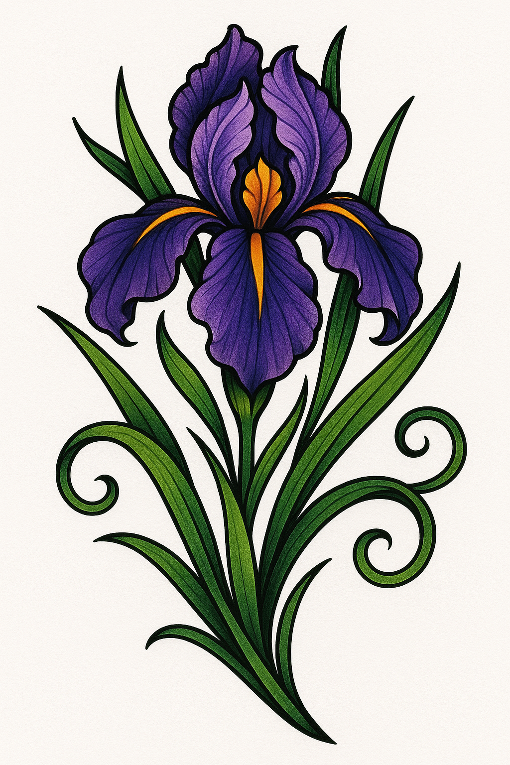 Detailed Illustration of a Purple Iris Flower with Elegant Green Leaves