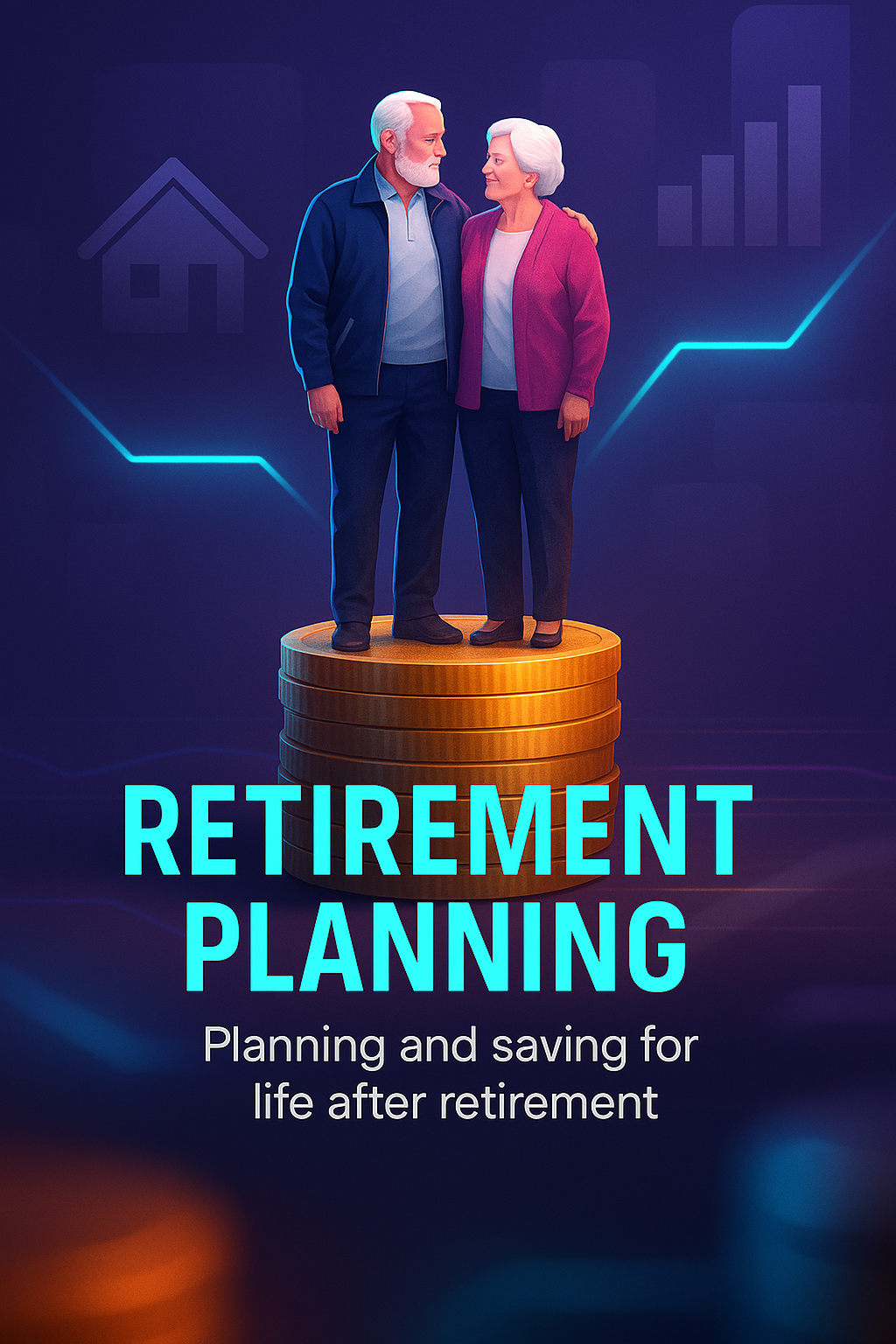 /Collection: /by davooda/Type: PNG/A visually engaging digital illustration depicting a couple standing on a stack of coins, symbolizing financial security in retirement. Ideal for financial advisement marketing.