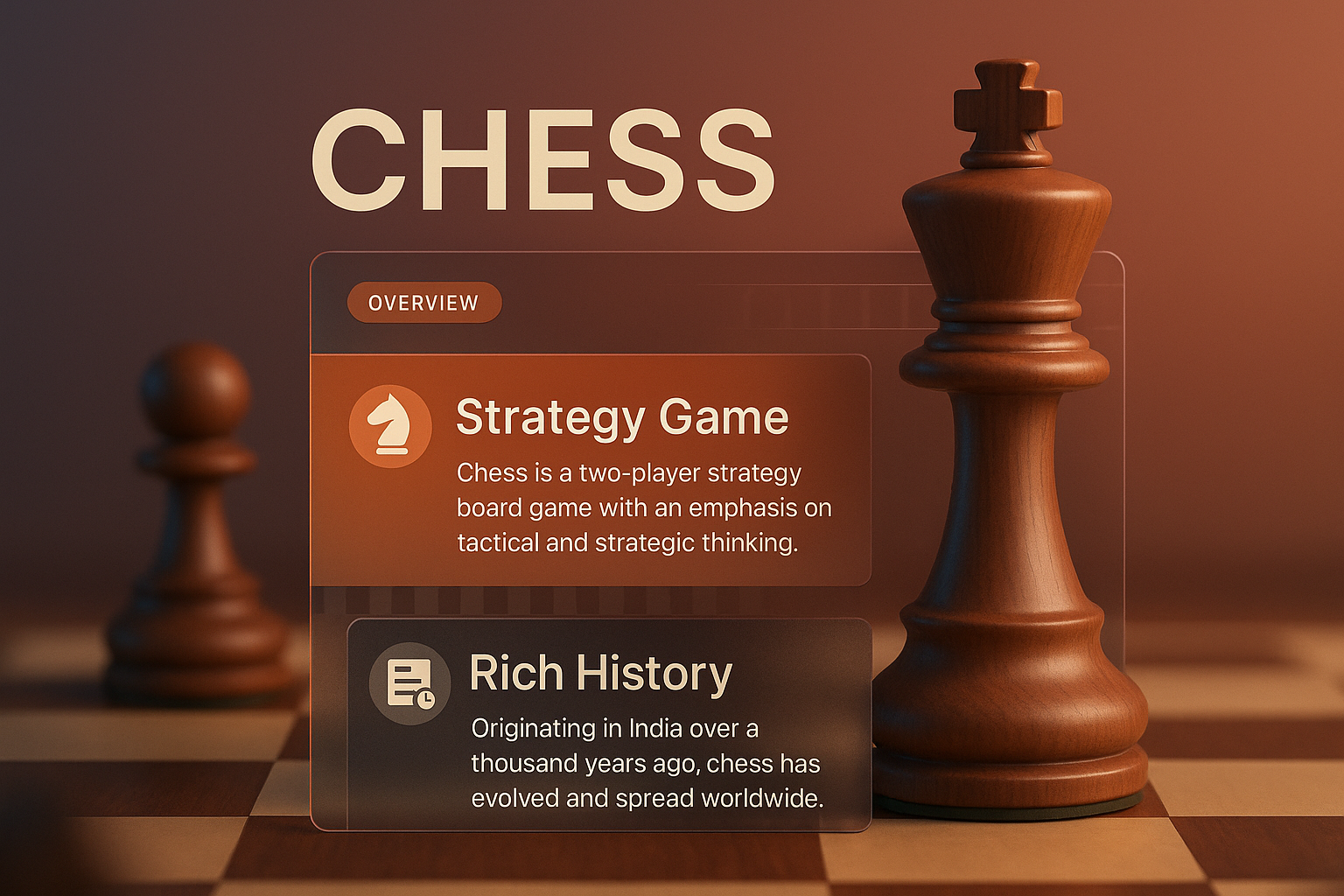 /Collection: /by davooda/Type: PNG/A visually appealing web design concept featuring a 3D chess piece with informative blocks. The layout integrates transparent panels for strategy game details and historical context.