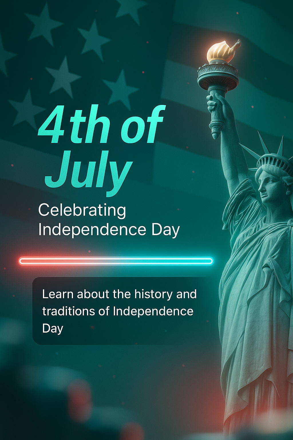 /Collection: /by davooda/Type: PNG/A vibrant digital graphic celebrating Independence Day, featuring the Statue of Liberty against a backdrop of the American flag, suitable for educational or festive promotions.