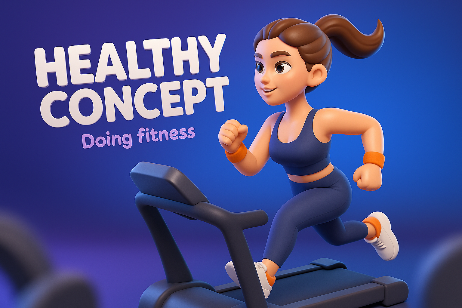 /Collection: /by davooda/Type: PNG/A vibrant 3D illustration of a woman running on a treadmill, embodying a healthy lifestyle. The dynamic composition features a smooth gradient background with engaging typography.