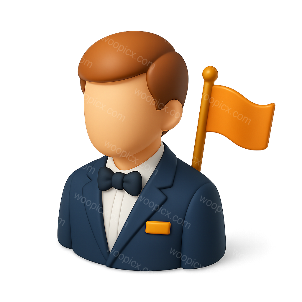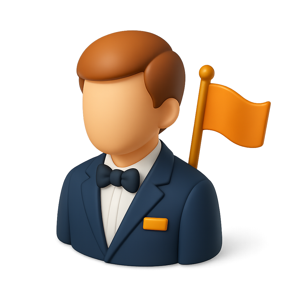 A 3D ambassador icon featuring a character in a tuxedo with a bow tie, holding an orange flag. The design has a smooth, volumetric feel against a gradient background.