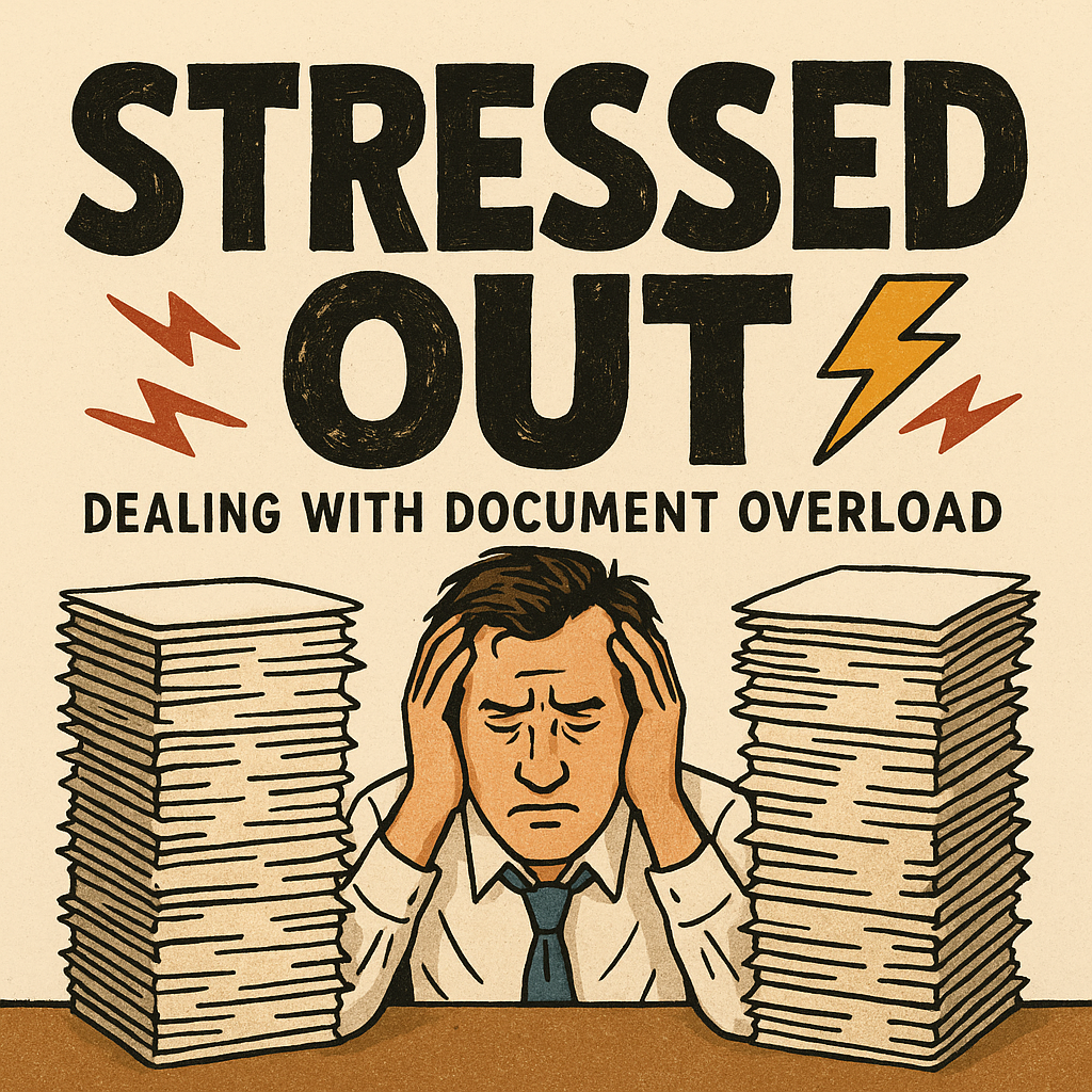 An illustrated graphic depicting a stressed individual surrounded by piles of documents, conveying the theme of document overload. Ideal for mental health awareness and stress management content.