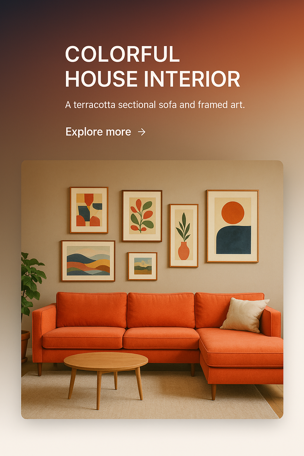 A vibrant living room featuring a terracotta sectional sofa, framed art on the walls, and a light-colored rug. The atmosphere is warm and inviting.