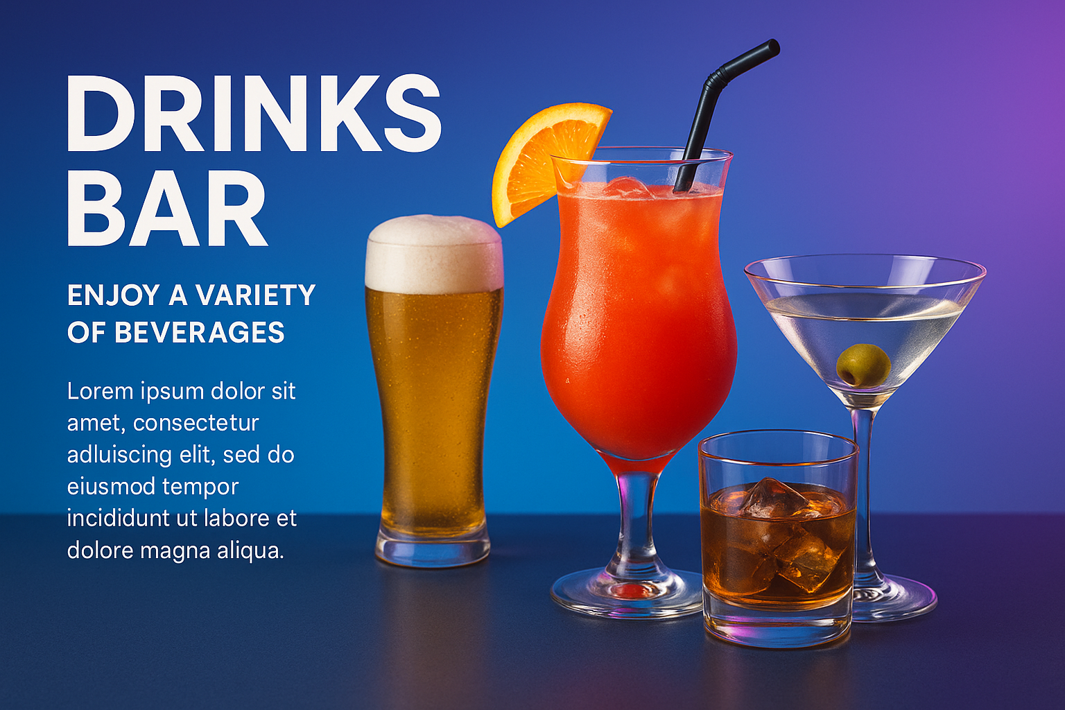 /Collection: /by davooda/Type: PNG/A visually appealing drinks bar design showcasing a variety of beverages. Features a vibrant gradient background with colorful cocktails, creating an engaging atmosphere.