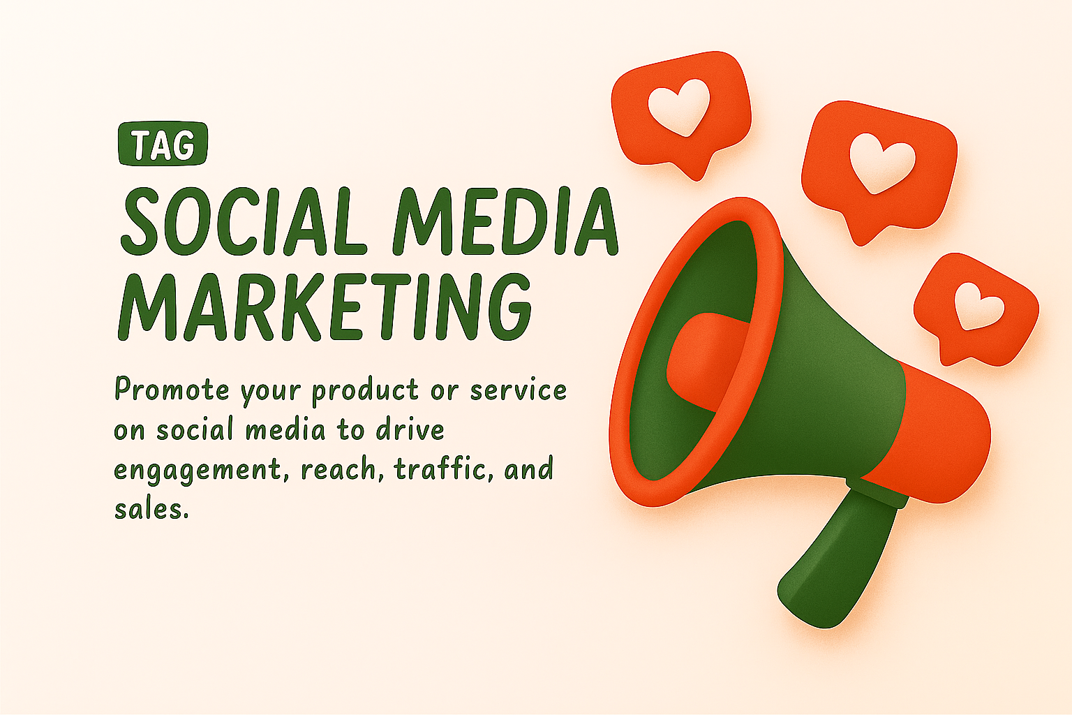 Colorful 3D graphic featuring a megaphone and heart icons, designed to promote social media marketing strategies. Ideal for digital marketing campaigns.